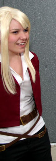 The wig started out as an Alicia XL in #613 from by New Look (purchased from Cosworx, when cosplay.com had a wig shop). I combed, cut, and styled the bangs over top of the existing wispy bangs, straightened the wig a bit, and pulled it up into a ponytail (Clip-in ponytails were pretty rare back in the day, and even so would not have worked for this hairstyle). The shirt was made from a blouse pattern that had the right kind of collar, and I heavily modified -- Facing was put in rather than sleeves, and I replaced the front button plackets with an invisible zipper. The pants were a pair of black Capri's that I shortened just a bit for accuracy. The belts (and sorry excuse for a fanny-pack) were made from a brown duck canvas, with belt buckles that I got off of belts from Value Village. The jacket was made from a burgundy-wine trigger-poplin. My first wrench prop I made myself from foam-core board, wonderflex, and many layers of acrylic paint in various colors. I later borrowed a real wrench from Darkain, and then finally acquired one of my own as a gift.